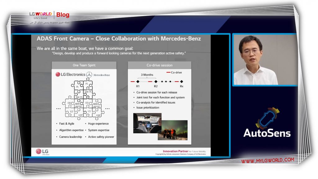 کارشناس هوش مصنوعی Vision در ال‌جی دکتر پارک یانگ کیونگ،  و البته دکتر بنجامین مارکس از تیم دوربین چند منظوره شرکت مرسدس بنز جایزه را دریافت کردند و سخنرانی نمودند؛ آنها در این سخنرانی تجربه ارزشمند همکاری چندین ساله خود به مفهوم ساخت دوربینی که ایمنی واقعی در زندگی را بهبود بخشیده و ضروریات ایمنی سختگیرانه NCAP اروپا را برآورده کند توضیح دادند. فناوری پیچیده ی توسعه یافته توسط این دو شرکت میتواند از یادگیری دقیق و حسگرهای چند رادار استفاده نماید تا داده‌های محیطی گسترده تری را برای تجزیه و تحلیل به واحد پردازش مرکزی ارسال کند. داده‌های بیشتر منجر به تجزیه و تحلیل بهتر و ایمنی بیشتر خواهد شد.
