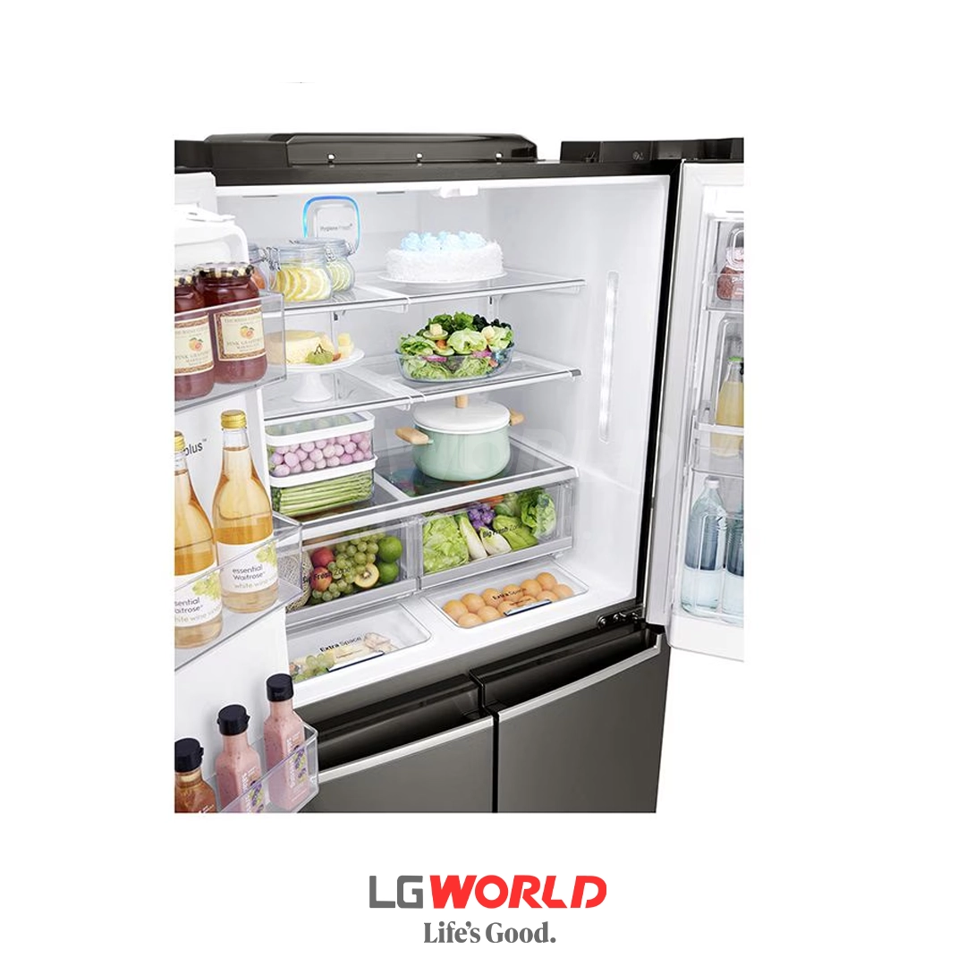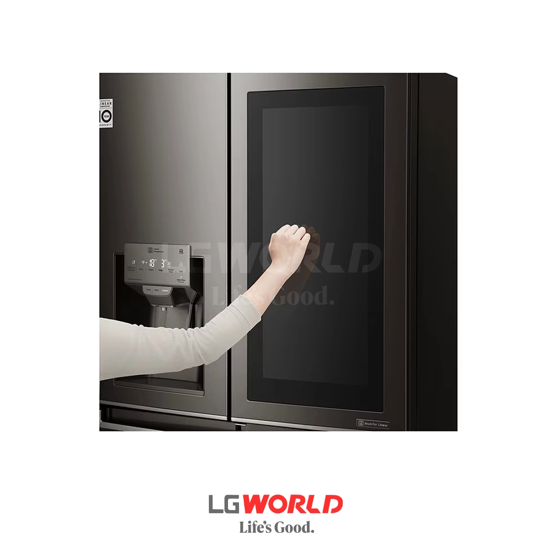 یکی از جذابترین و تکنولوژیکترین ویژگیهایی که یخچال ساید بای ساید 34 فوت ال جی LG X39 را از سایر رقبای خود متمایز میکند، پنل شیشهای مشکی رنگ و براق روی درب سمت راست یخچال است که به نام تکنولوژی اینستاویو شناخته میشود. این پنل شیشهای در حالت عادی کاملاً تیره و مشکی است و با طراحی کلی بدنه دودی رنگ هارمونی بینظیری دارد، اما جادوی اصلی زمانی اتفاق میافتد که شما تنها دو بار پیاپی روی این شیشه ضربه میزنید. با این عمل، چراغهای LED داخلی روشن شده و شیشه شفاف میشود، به طوری که شما میتوانید بدون نیاز به باز کردن درب یخچال، محتویات داخل محفظه دسترسی سریع یا همان Door-in-Door را مشاهده کنید.