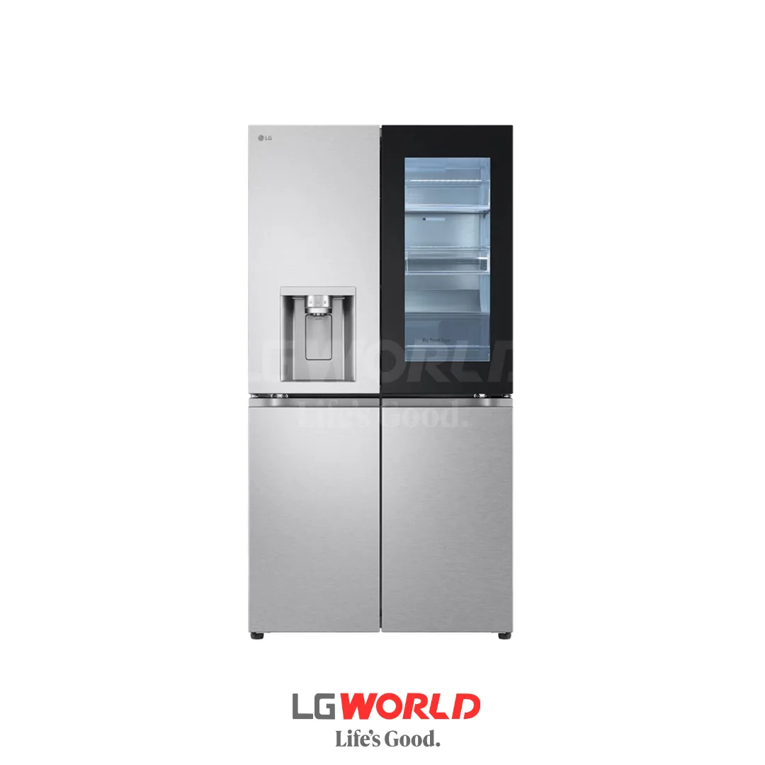 نکته بسیار مهم در طراحی بدنه این مدل، حذف حاشیههای زائد و تمرکز بر یکپارچگی بصری است. برخلاف مدلهای قدیمیتر که درب بار یا همان هومبار دارای قابهای ضخیم بود، در این مدل شاهد یک پنل شیشهای تمامقد و بدون فریم هستیم که تحت عنوان قابلیت اینستاویو شناخته میشود. این پنل شیشهای دودی که بخش عظیمی از درب سمت راست یخچال را پوشانده است، تنها با دو ضربه انگشت شفاف شده و فضای داخلی را نمایان میسازد. این ویژگی نه تنها جلوهای لوکس و آیندهنگرانه به دستگاه میبخشد، بلکه مانع از هدررفت سرمای گرانبها میشود، چرا که برای دیدن محتویات پرمصرف نیازی به باز کردن درب اصلی نخواهد بود.